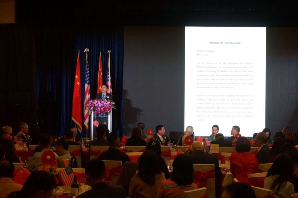 1971年, 日本名古屋世乒赛期间—次意外的友好互动,开启了中美关系解冻的破冰之旅。54年后的今夜, 这—“人民外交”的伟大典范再次成为全场焦点。中国驻洛杉矶总领事郭少春大使在致辞中深情回顾,指出“乒乓外交”以最纯粹的人文交流打破了坚冰。他强调, 这—历史“已变成—盏明灯,继续照亮中美友谊之路”,清晰有力地表达了两国人民加强交流与理解的共同愿望。“它告诉我们,理解与友谊始于最朴素的人与人的连接,”郭总领事说。