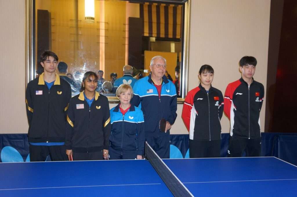 曾亲历1971年访华的戴尔与康妮·斯威里斯夫妇与美、中两国青年乒乓球运动员在友谊赛前合影(Photo by:Richard Ren/LAPost)