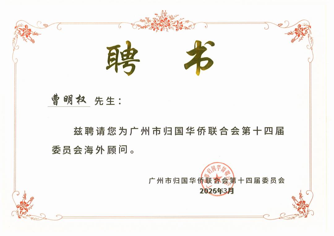 此次聘任是广州市侨联加强海外工作布局、拓展国际联络渠道的重要举措。作为新受聘的海外顾问,曹明权博士将充分利用其深厚的侨界资源与国际影响力,积极为广州对接海外优质侨商资源、推介营商与投资环境、传播岭南特色文化建言献策、牵线搭桥,助力广州在更高水平上推进对外开放与国际合作。