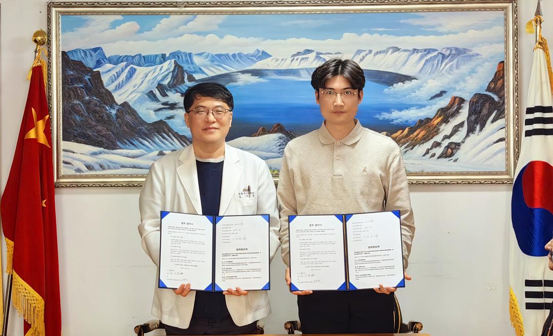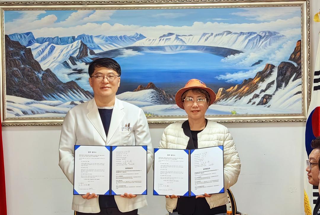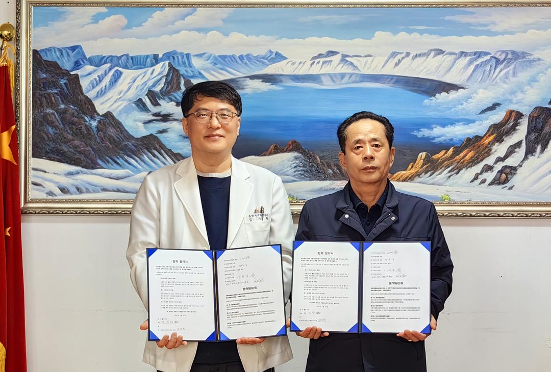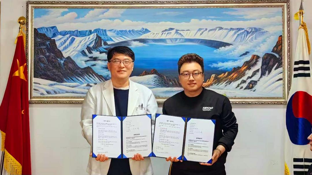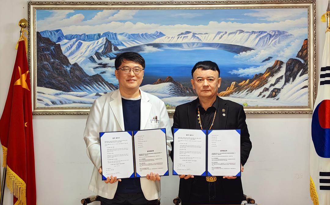 在韩同胞温情分享协会会长(右)与韩国88世界牙科医院(左)正式签署合作协议后合影留念