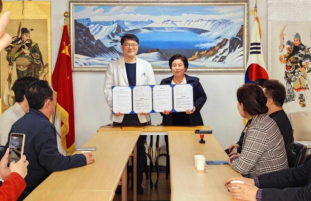 韩国哈尔滨侨界会会长高金凤(右)与韩国88世界牙科医院(左)正式签署合作协议后合影留念