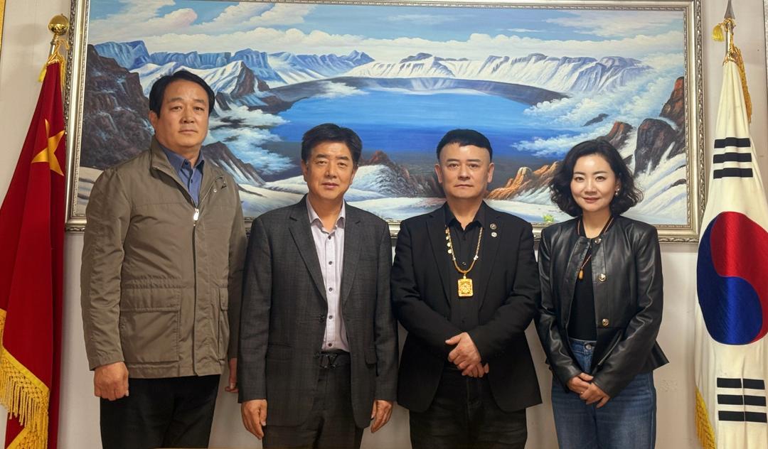 首尔中国侨民协会会长曹明权(右二)、国际多文化交流协会会长兼韩国川渝总商会秘书长王科与金大焕(左二)、李範柱(左一)等人合影留念