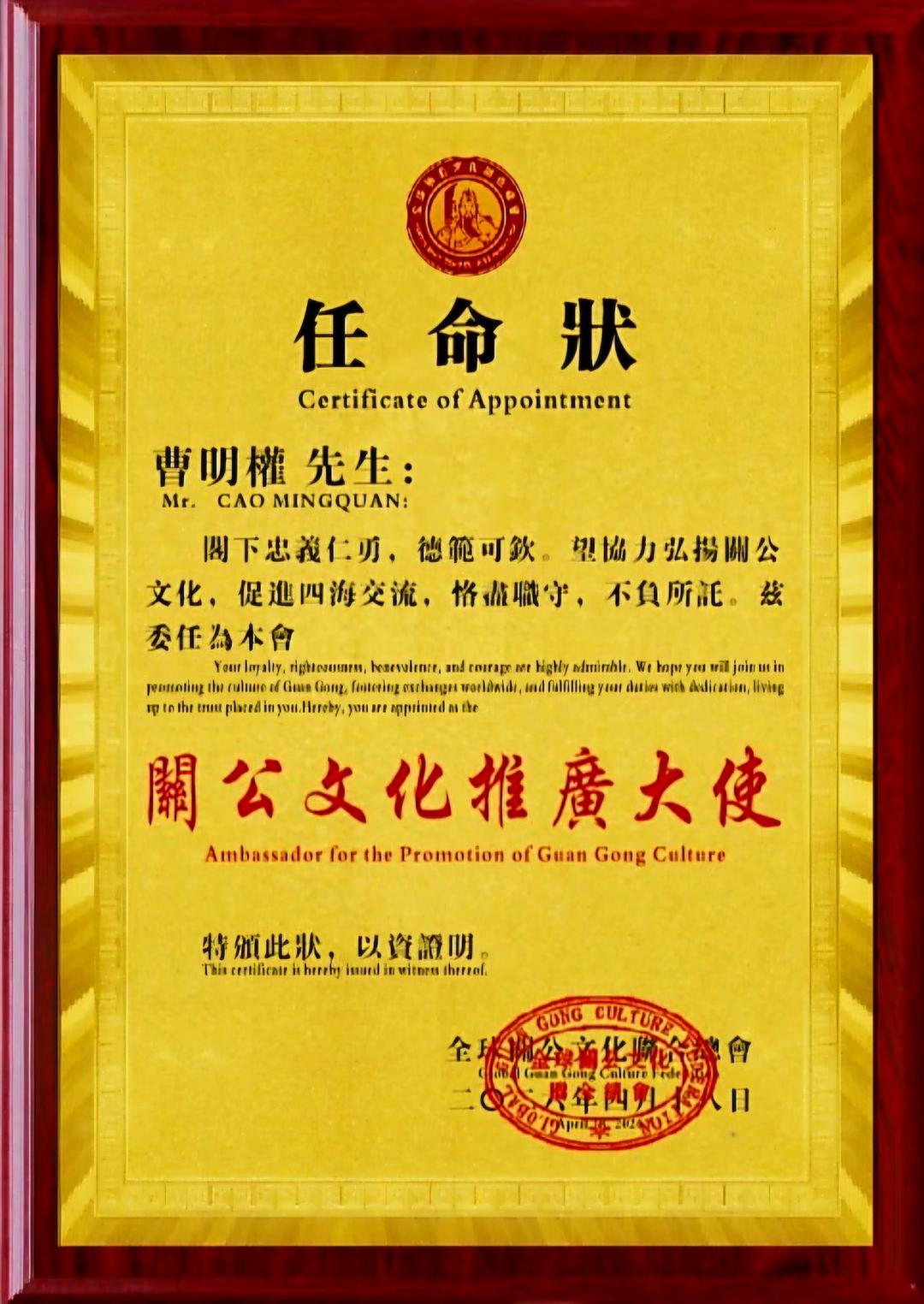 此次聘任不仅是对曹明权博士个人贡献的肯定,更彰显了中华优秀传统文化在海外的蓬勃生命力,为关公文化在新时代的全球化传播注入了新动能。