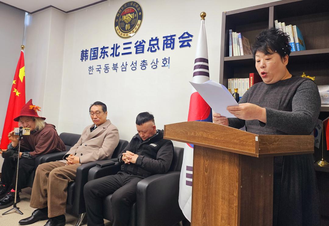 韩国东北三省总商会副会长赵美善在宣读韩国东北三省总商会章程等