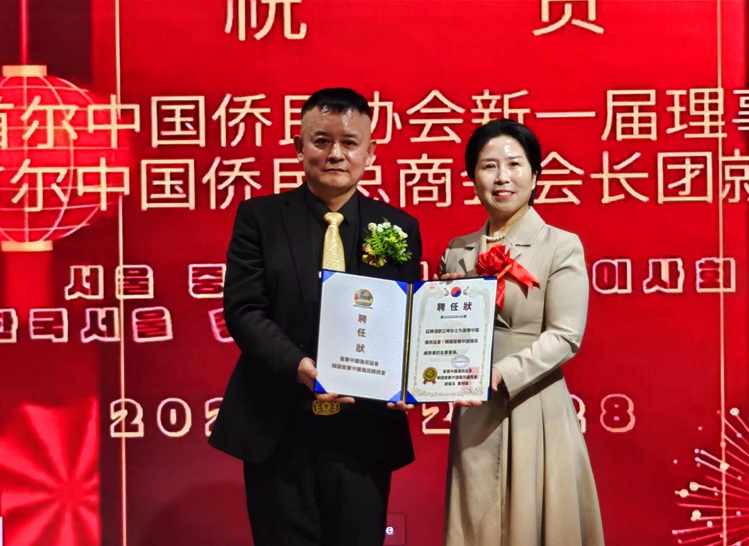 韩国鸡西侨商会会长李华春(右)被聘为韩国首尔中国侨民总商会常务副会长