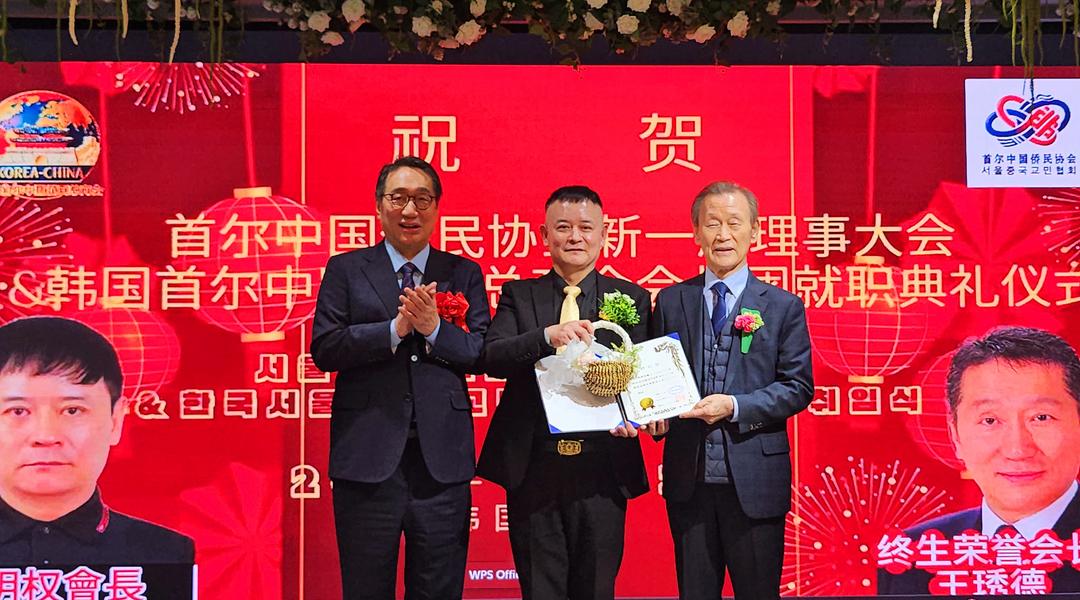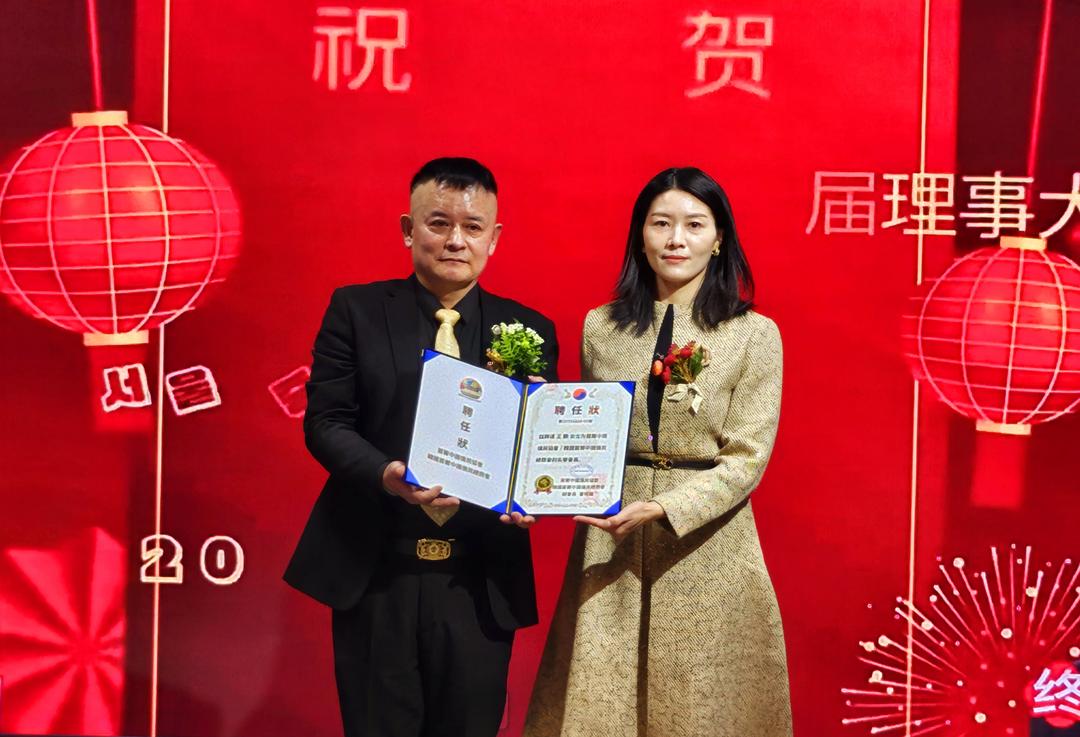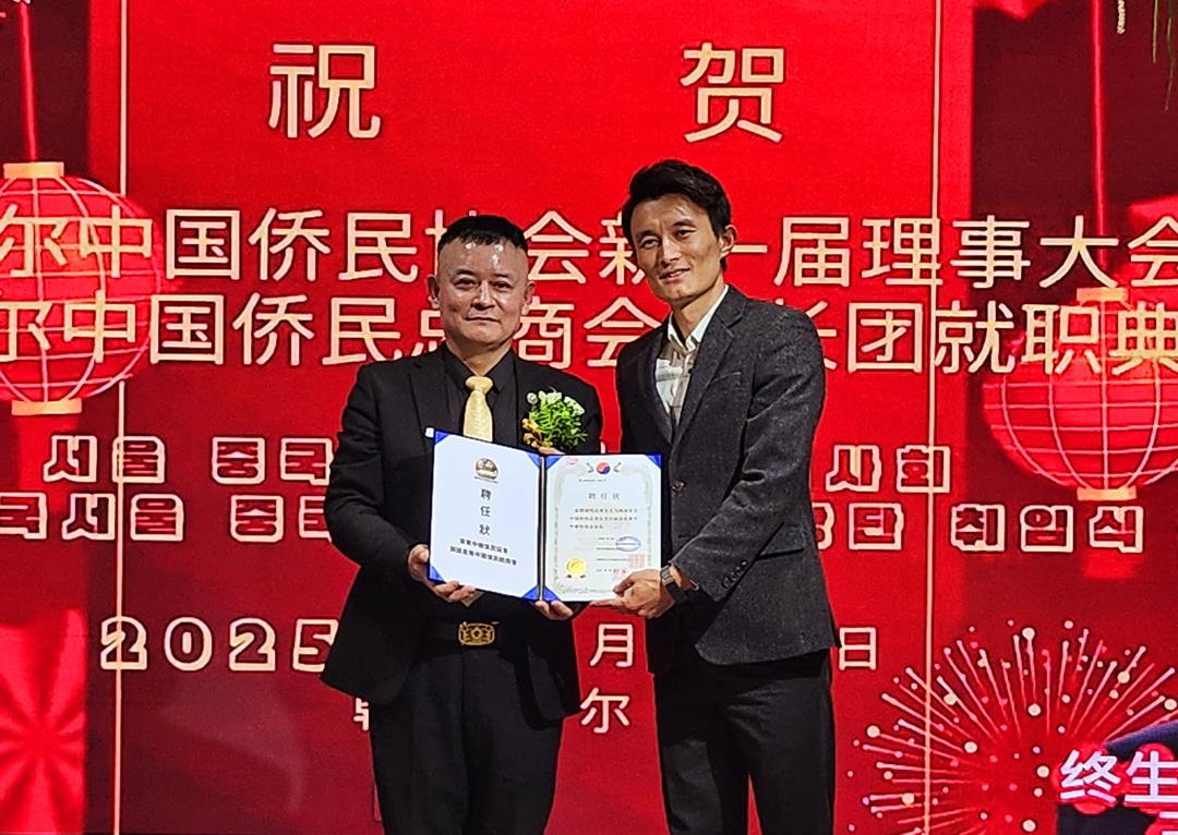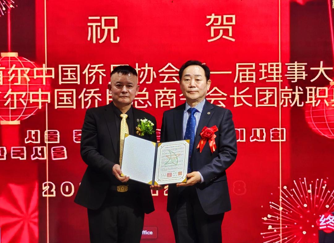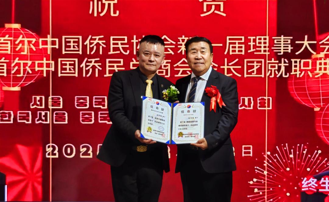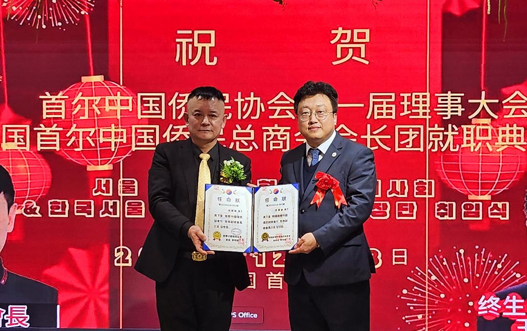 明志勇(右)被聘为韩国首尔中国侨民总商会副会长兼中华餐饮协会会长