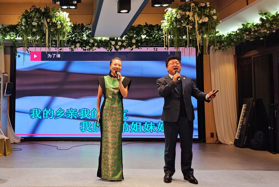 韩国首尔中国侨民总商会常务副会长李华春(左)与在韩同胞歌手--韩国川渝总商会副秘书长李施(右)合唱歌曲《为了谁》为大会助兴