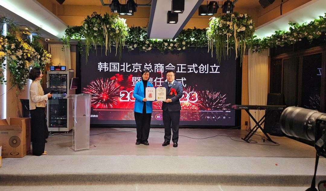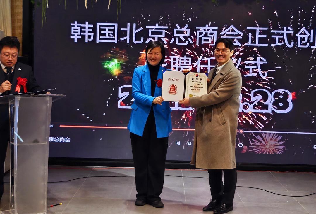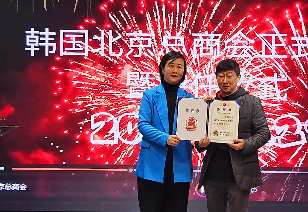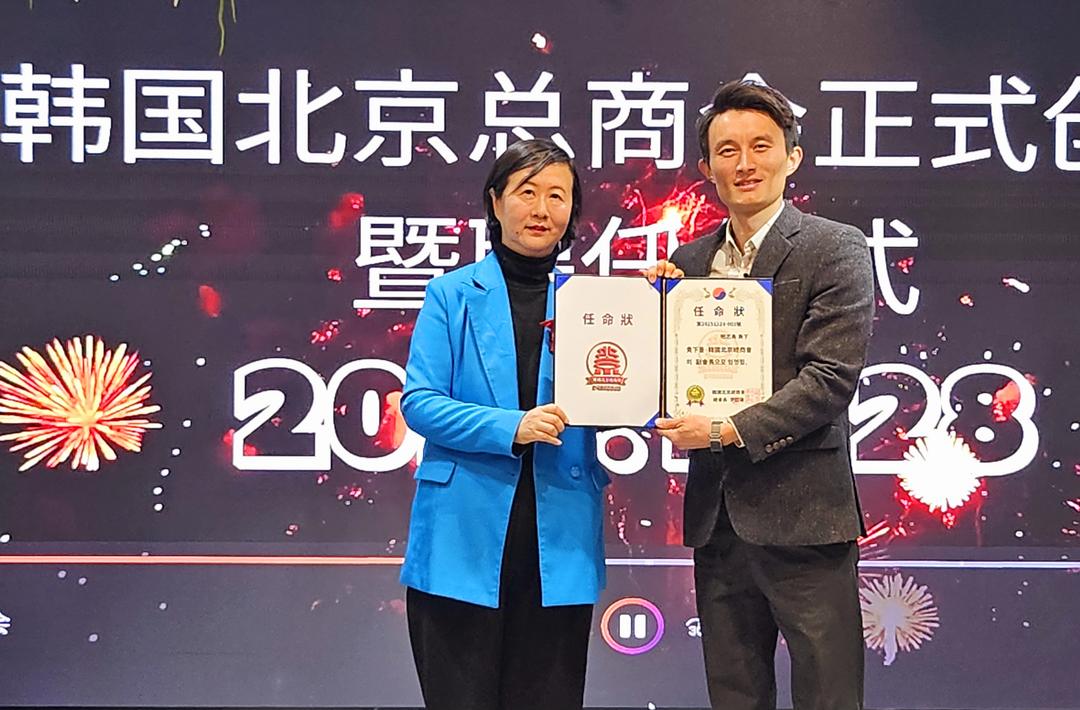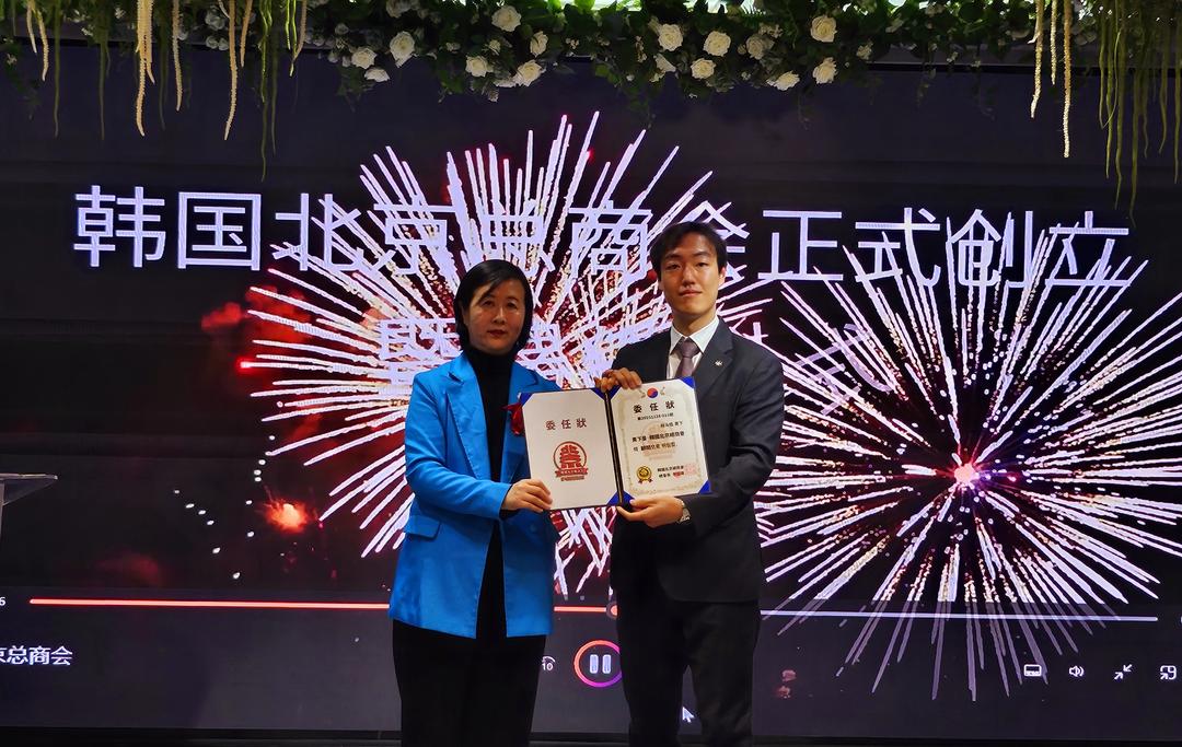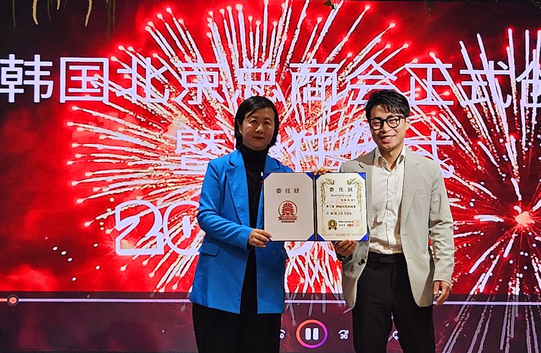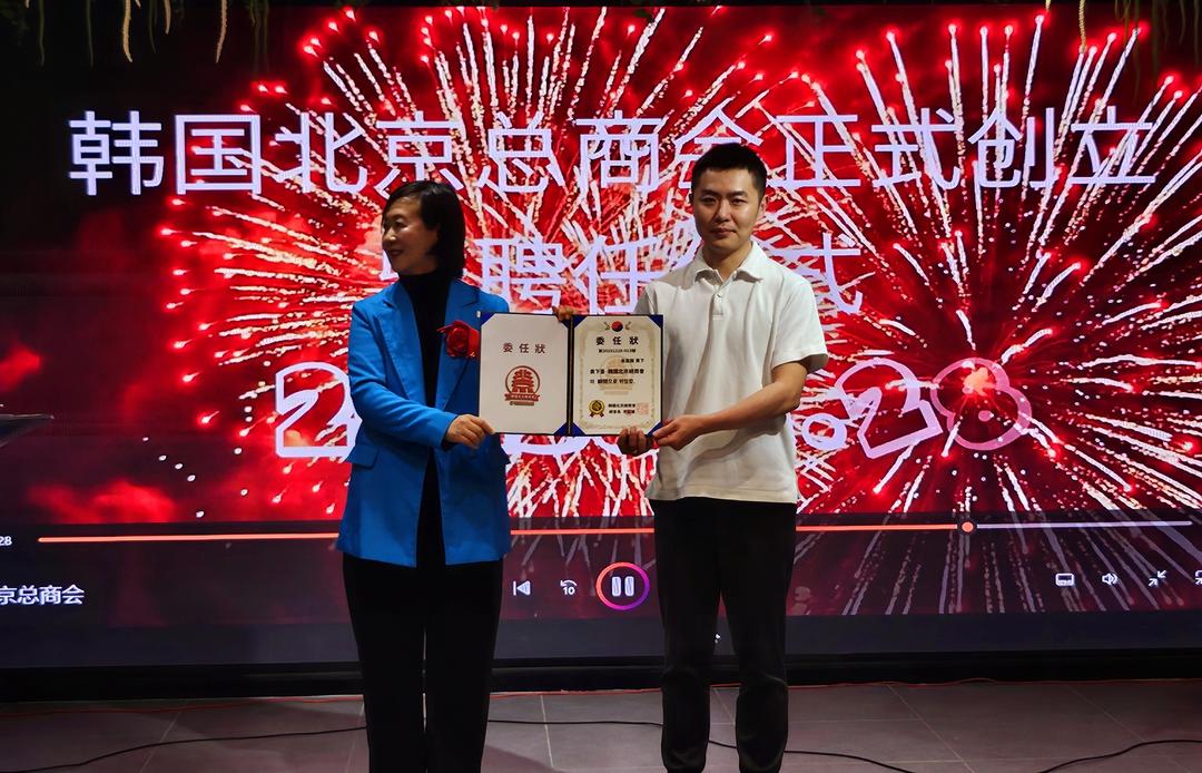 韩国青年创业协会会长韩智民(右)被韩国北京总商会聘任为顾问