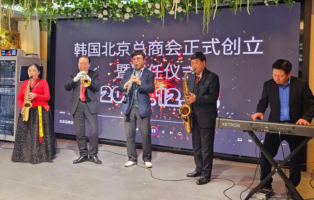 在韩同胞乐队演奏艺术团为庆贺韩国北京总商会的成立进行乐器演奏表演