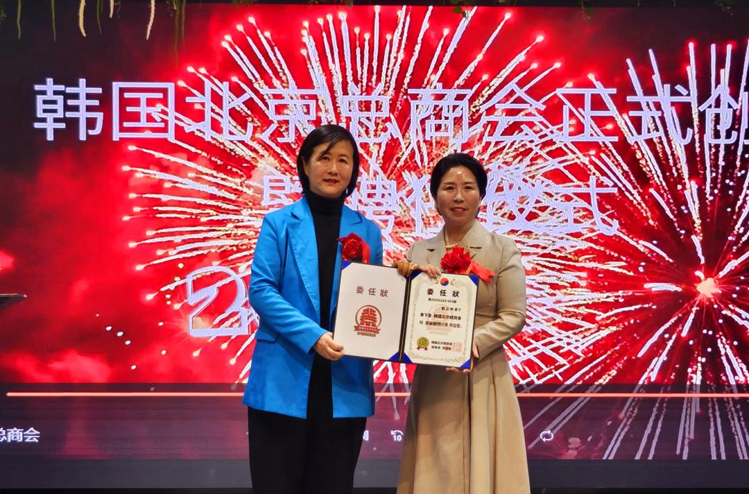 北京市侨联青年委员会海外委员朱叶(右)被韩国北京总商会聘任为理事