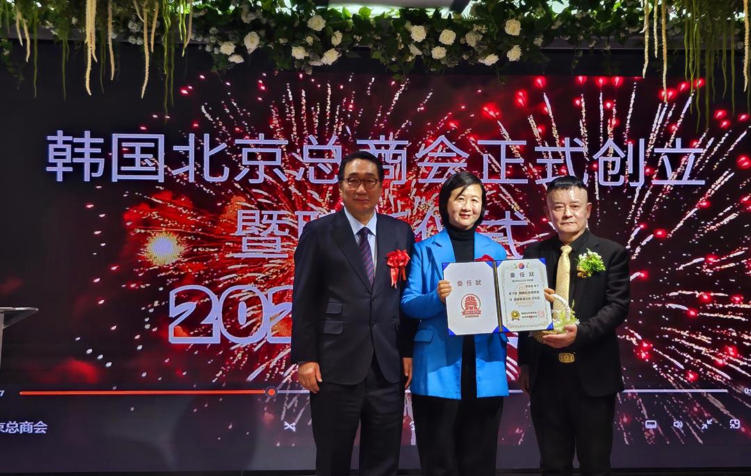 韩国北京总商会荣誉会长王琇德(左)、韩国北京总商会名誉会长曹明权博士(右)共同为新当选的韩国北京总商会会长李亚珊(中)颁发聘任书后共同合影留念